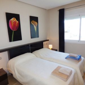 The distribution is as follows: 1 x Double bed, 2 x twin beds. It also has 1 private parking space with direct lift access to the property on the first floor. It is located in a secure gated community with access to communal gardens. There are 3 communal swimming pools with on heated all year round.
